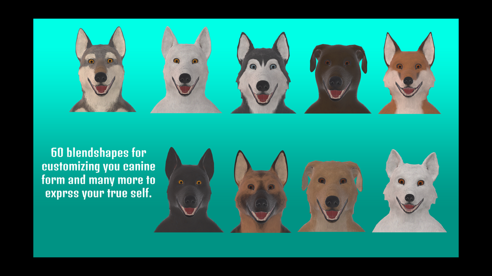 Create whatever form of canine your heart desires with over 140 blend shapes in all, as well as a pointy eared and floppy eared version of the rig. All the tools are at your disposal with the Blender, Substance Painter, and Photoshop files provided. But if you are just wanting to jump right into VRChat, there are a number of premade puppers for you to choose from. For each of the premade avatars, there is also a Quest compatible version alongside it.
