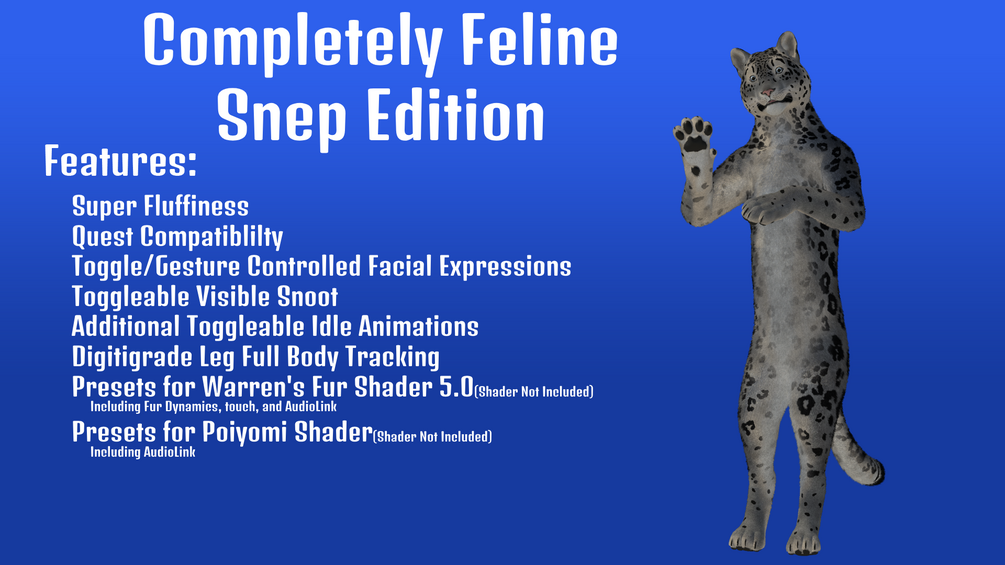 Warren's Fur Shader - Recommended for the best experience. This avatar is already set up to work with the shader updated 5.0 version of the shader and includes fur dynamics, touch, and AudioLink. So no assembly is required.